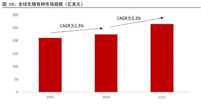 全球生物育種市場規(guī)模有望加速增長。根據(jù)先正達招股說明書,Kynetec 數(shù)據(jù)顯示,2015- 2020 年,全球生物育種試產(chǎn)規(guī)模從 210 億美元上升至 224 億美元,CAGR 為 1.3%。由于生物育種在北美和南美的滲透率較高,從而導(dǎo)致市場規(guī)模增速放緩。根據(jù) Kynetec,2020 年生物育種在全球種業(yè)市場中的占比約為 48.5%。根據(jù)先正達招股說明書,預(yù)計全球生物育種市場規(guī)模在 2025 年將達到 264 億美元,2020-2025 年復(fù)合增長率為 3.3%,預(yù)計生物育種在中國的推廣應(yīng)用將成為市場增速上行的原因之一。