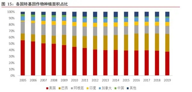 轉(zhuǎn)基因種植大國的轉(zhuǎn)基因平均應(yīng)用率高。根據(jù)前瞻產(chǎn)業(yè)研究院,2019 年,美國、巴西、 阿根廷、加拿大、印度的轉(zhuǎn)基因平均應(yīng)用率分別為 95%、94%、100%、90%、94%,已經(jīng)是 接近飽和的水平。若有新的轉(zhuǎn)基因作物和性狀批準并進行商業(yè)化,上述國家的轉(zhuǎn)基因面積將有機會進一步擴大。