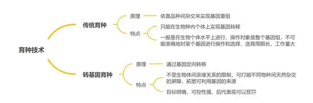 轉(zhuǎn)基因育種和傳統(tǒng)育種技術(shù)一脈相承。育種技術(shù)主要包括馴化、人工育種、誘變育種、雜交育種、分子標記輔助育種、轉(zhuǎn)基因育種等。育種技術(shù)不斷發(fā)展,育種效率不斷得以 提升。轉(zhuǎn)基因育種和傳統(tǒng)育種技術(shù)一脈相承,本質(zhì)上都是通過改變基因的組成來獲得優(yōu) 良性狀。