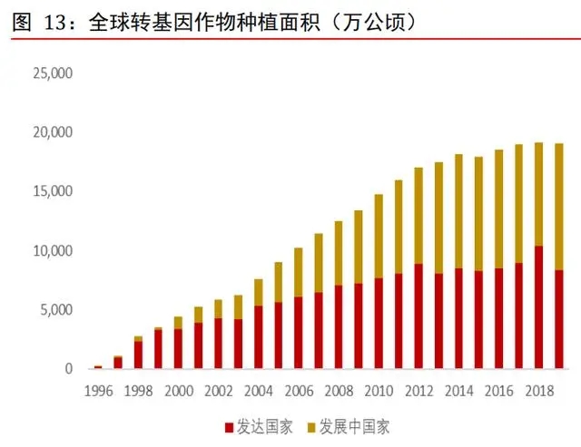 20 世紀末至今,全球轉(zhuǎn)基因作物種植面積整體保持增長趨勢,其中發(fā)展中國家近年來表現(xiàn)更強。根據(jù) Wind,1996-2019 年,全球轉(zhuǎn)基因作物種植面積從 170 萬公頃上升至 19040 萬公頃,期間 CAGR 為 22.77%。同期,發(fā)展中國家轉(zhuǎn)基因作物種植面積的復(fù)合增速為 35.41%,是發(fā)達國家轉(zhuǎn)基因作物種植面積復(fù)合增速的 1.89 倍。2019 年,發(fā)達國家和發(fā)展中國家的轉(zhuǎn)基因作物種植面積分別為 8378 萬公頃和 10662 萬公頃,占比分別為 44%和 56%。從占比分析,1996-2019 年,發(fā)達國家轉(zhuǎn)基因作物種植面積占比從 94.12%下滑至 44.00%,發(fā)展中國家轉(zhuǎn)基因作物種植面積占比從 5.88%攀升至 56.00%。從國家數(shù)量來看, Wind 數(shù)據(jù)顯示,2019 年開展轉(zhuǎn)基因作物種植的國家共有 29 個,其中發(fā)達國家 5 個,發(fā)展中國家 24 個。