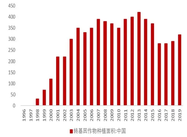 我國轉(zhuǎn)基因作物種植面積較小,占全球比重較低。根據(jù) Wind, 2019 年中國的轉(zhuǎn)基因作物種植面積為 320 萬公頃,占全球比重為 1.68%,排全球第八位。1997 年開始的十年間, 我國轉(zhuǎn)基因作物種植面積快速增長,但隨著政策收緊后,我國轉(zhuǎn)基因種植發(fā)展緩慢。2016 年重提轉(zhuǎn)基因商業(yè)化,未見明顯成效。可見,我國轉(zhuǎn)基因種植行業(yè)成長與國家政策息息相關(guān)。2020 年,中央經(jīng)濟工作會議首次強調(diào)種子問題,轉(zhuǎn)基因作物種植面積有望迎來新 一輪擴張。