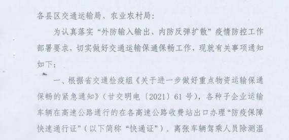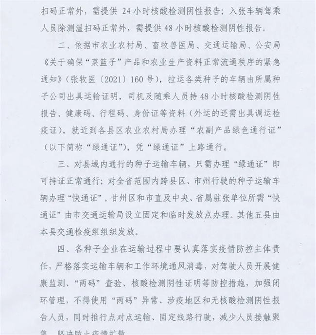 據(jù)悉,張掖市農(nóng)業(yè)農(nóng)村局聯(lián)合張掖市交通運輸局在十月底便出臺了《關于保障種子運輸有關事項的通知》。根據(jù)該通知,目前種子運輸只需申請“快通證”“綠通證”即可上路,審批手續(xù)并不復雜。