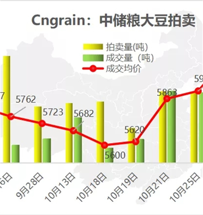 11月2日,中儲糧計劃拍賣52395噸國產大豆,再度全部成交。10月21日以來的三次大豆拍賣成交延續(xù)火爆局面,均為100%成交,成交均價6111元/噸,較上次大漲204元/噸,其中,東北地區(qū)成交均價6035元/噸。近期由于黑龍江北部疫情嚴重,大豆市場流通量相對較小,東北產區(qū)大豆價格強勢運行。