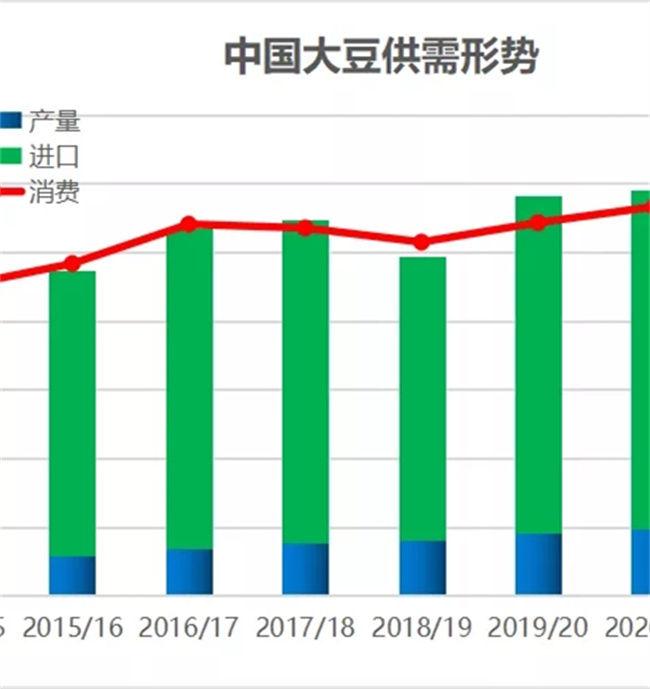 根據農業(yè)農村部發(fā)布2021年10月大豆供需形勢分析,2021/22年度中國大豆種植面積9347千公頃(1.4億畝),較上年度減少5.4%,主要原因是玉米種植比較效益優(yōu)勢明顯,主產區(qū)部分大豆改種玉米。今年的國產大豆產量在1865萬噸,而去年同期的預估是1960萬噸,也就是今年大豆的產量大概比去年低了100萬噸上下。