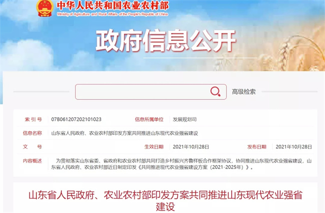 為貫徹落實山東省委、省政府和農(nóng)業(yè)農(nóng)村部共同打造鄉(xiāng)村振興齊魯樣板合作框架協(xié)議,協(xié)同推進山東現(xiàn)代農(nóng)業(yè)強省建設(shè),近日,山東省人民政府、農(nóng)業(yè)農(nóng)村部制定印發(fā)《共同推進現(xiàn)代農(nóng)業(yè)強省建設(shè)方案(2021-2025年)》(以下簡稱《方案》)。