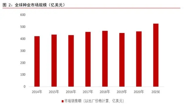 全球種業(yè)市場(chǎng)規(guī)模保持增長(zhǎng)。根據(jù)全球農(nóng)業(yè)市場(chǎng)調(diào)研公司 Kynetec 統(tǒng)計(jì),全球種業(yè)市場(chǎng)規(guī)模(以出廠價(jià)格計(jì)算市場(chǎng)銷售額)由 2014 年的 423 億美元增長(zhǎng)至 2020 年 463 億美元, 年均復(fù)合增長(zhǎng)率約為 1.5%。預(yù)計(jì)到 2025 年,全球種業(yè)整體市場(chǎng)規(guī)模將增長(zhǎng)至 527 億美元,年均復(fù)合增速約為 2.6%,增長(zhǎng)驅(qū)動(dòng)力主要來(lái)自于生物育種滲透率不斷上升、雜交作物的推廣、消費(fèi)者對(duì)植物蛋白和蔬菜的需求不斷上升等。
