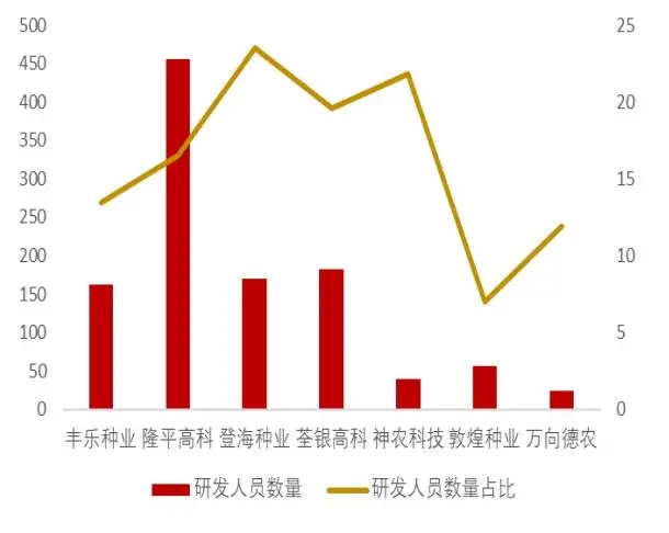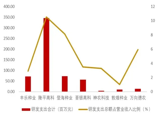 我國(guó)的種子企業(yè)研發(fā)支出較低。在國(guó)際種子市場(chǎng)上,世界種業(yè)前四大巨頭,拜爾、巴斯夫、科迪華和先正達(dá)的研發(fā)水平和能力都處于行業(yè)的頂尖,而我國(guó)種子企業(yè)的研發(fā)支出普遍較低。從研發(fā)支出來(lái)看,A 股上市公司的研發(fā)支出在 2016 年《中華人民共和國(guó)種子法》修訂審定條例,允許企業(yè)自行試驗(yàn)后進(jìn)入了一輪新的快速增長(zhǎng)期,但 2019 年出現(xiàn)下滑趨勢(shì)。A 股上市公司的研發(fā)支出合計(jì)最高不超過(guò) 7 億元,遠(yuǎn)低于巴斯夫、先正達(dá)、科迪華等全球種業(yè)龍頭 2020 年平均超 110 億元的研發(fā)支出。從研發(fā)支出占比來(lái)看,國(guó)內(nèi)隆平高科的研發(fā)投入占比最為突出,達(dá)到 10%,其他上市種業(yè)公司研發(fā)投入占營(yíng)收比重普遍在 6%以下。根據(jù)聯(lián)合國(guó)糧農(nóng)組織數(shù)據(jù),中國(guó)在 2019 年的糧食總產(chǎn)量接近 6.64 億 噸,約為全球糧食總產(chǎn)量的 24.4%,是全球第一糧食生產(chǎn)大國(guó)。但是,中國(guó)糧食產(chǎn)量與國(guó)內(nèi)種企的育種研發(fā)水平嚴(yán)重不匹配。