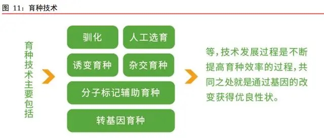 轉(zhuǎn)基因育種和傳統(tǒng)育種技術(shù)一脈相承。育種技術(shù)主要包括馴化、人工育種、誘變育種、雜交育種、分子標(biāo)記輔助育種、轉(zhuǎn)基因育種等。育種技術(shù)不斷發(fā)展,育種效率不斷得以 提升。轉(zhuǎn)基因育種和傳統(tǒng)育種技術(shù)一脈相承,本質(zhì)上都是通過(guò)改變基因的組成來(lái)獲得優(yōu) 良性狀。