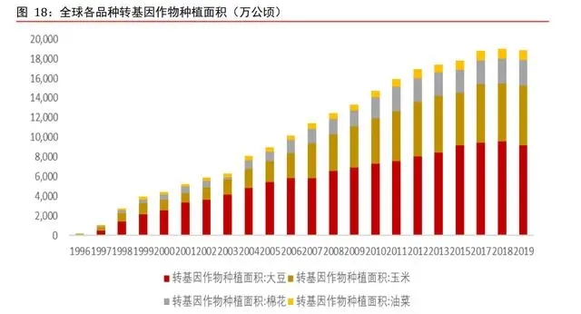 玉米和大豆是全球轉(zhuǎn)基因作物的主要品類。根據(jù) Wind,1996-2019 年,大豆、玉米、棉 花、油菜等轉(zhuǎn)基因作物在全球的種植面積逐漸增加,期間四個(gè)品種的復(fù)合增速分別為 25.44%、25.99%、16.28%和 22.22%。2019 年,全球大豆、玉米、棉花、油菜的種植面積分別為 9,190 萬(wàn)公頃、6,090 萬(wàn)公頃、2,570 萬(wàn)公頃和 1,010 萬(wàn)公頃;其中大豆和玉米占比分別達(dá)到 48%和 32%,是主要的轉(zhuǎn)基因作物品種。