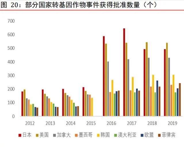 轉(zhuǎn)基因玉米獲得批準(zhǔn)的數(shù)量最多,發(fā)達(dá)國(guó)家的轉(zhuǎn)基因作物事件獲得批準(zhǔn)數(shù)量更多。按品種來(lái)看,Wind 數(shù)據(jù)顯示,2006-2019 年,轉(zhuǎn)基因玉米的獲批數(shù)量都遠(yuǎn)超棉花、油菜、大豆等品類,2017 年轉(zhuǎn)基因玉米獲批數(shù)量更是高達(dá) 232 個(gè)。分國(guó)家來(lái)看,美國(guó)和日本輪流爭(zhēng)奪轉(zhuǎn)基因作物事件獲得批準(zhǔn)數(shù)量最多的國(guó)家,絕對(duì)數(shù)量上遙遙領(lǐng)先其他國(guó)家。其次, 近年來(lái)加拿大的轉(zhuǎn)基因作物事件獲得批準(zhǔn)數(shù)量穩(wěn)居行業(yè)第三。根據(jù) Wind,2019 年,美 國(guó)、日本、加拿大的轉(zhuǎn)基因作物事件獲得批準(zhǔn)數(shù)量分別為 539、493 和 429 個(gè)。