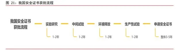 轉(zhuǎn)基因種子獲得安全證書的流程周期較長(zhǎng)。根據(jù)我國(guó)現(xiàn)行種子法規(guī)定,轉(zhuǎn)基因種子需要經(jīng)歷安全證書獲批和種子審定上市兩個(gè)階段,才能正式推出市場(chǎng)。根據(jù)前瞻產(chǎn)業(yè)研究院, 我國(guó)轉(zhuǎn)基因種子安全證書的獲批流程分為 5 步,分別為實(shí)驗(yàn)研究(1-2 年)、中間試驗(yàn) (1-2 年)、環(huán)境釋放(1-2 年)、生產(chǎn)性試驗(yàn)(1-2 年)、申請(qǐng)安全證書(3-5 年)。整個(gè)生物安全證書申請(qǐng)獲批流程較長(zhǎng),需要 7-13 年。獲得生產(chǎn)應(yīng)用安全證書,是糧食作物國(guó) 產(chǎn)轉(zhuǎn)基因品種商業(yè)化的第一步。在拿到生物安全證書后,后續(xù)還需要通過(guò)品種審定、登記審批、申請(qǐng)生產(chǎn)經(jīng)營(yíng)許可證,才能商業(yè)化應(yīng)用。其中品種審定尤其重要,相當(dāng)于商業(yè)化應(yīng)用的放行條。