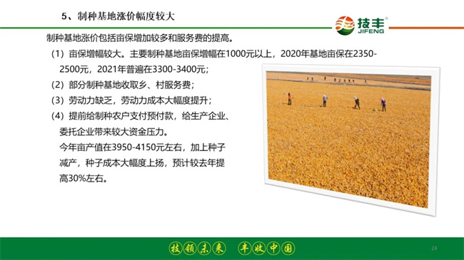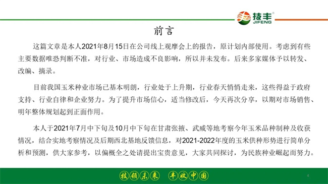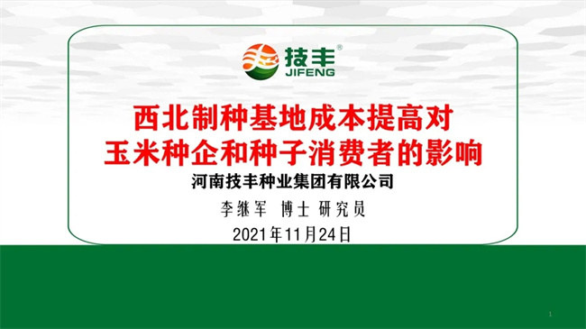 編者按 11月24日,河南技豐種業(yè)集團(tuán)有限公司董事長李繼軍博士在國家2022年玉米種業(yè)發(fā)展形勢視頻研討會上分享了題為《西北制種基地成本提高對玉米種企和種子消費(fèi)者的影響》的報告。李繼軍博士于2021年7月中下旬及10月中下旬在甘肅張掖、武威等地考察今年玉米品種制種及收獲情況,他結(jié)合實(shí)地考察情況以及后期西北基地反饋信息,對2021—2022年度的玉米供種形勢進(jìn)行了科學(xué)的分析和預(yù)測。現(xiàn)將李繼軍博士的報告內(nèi)容分享如下,供廣大業(yè)內(nèi)同仁參考。