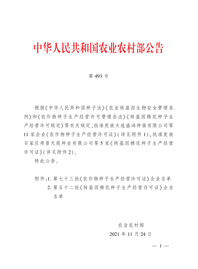 中華人民共和國(guó)農(nóng)業(yè)農(nóng)村部公告第493號(hào)
