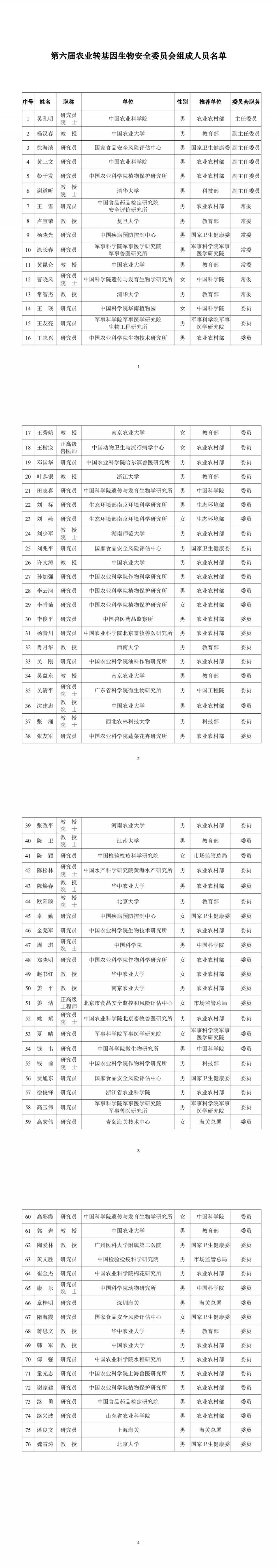 農(nóng)業(yè)農(nóng)村部關(guān)于印發(fā)第六屆農(nóng)業(yè)轉(zhuǎn)基因生物安全委員會(huì)組成人員名單的通知
