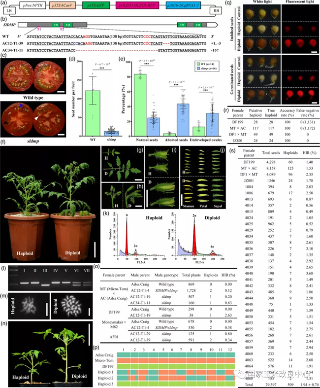 研究團(tuán)隊在克隆玉米單倍體關(guān)鍵誘導(dǎo)基因ZmDMP的基礎(chǔ)上,通過序列比對,發(fā)現(xiàn)ZmDMP在番茄中存在1個同源基因。實(shí)驗(yàn)結(jié)果表明,敲除該基因后的番茄材料在產(chǎn)生敗育種子的同時,可以在雜交和自交后代中形成一定比例的母本單倍體,證明了番茄中SlDMP基因突變同樣具備獨(dú)立的單倍體誘導(dǎo)的能力。對雜交產(chǎn)生的單倍體進(jìn)行的高通量測序結(jié)果表明,這些單倍體均不攜帶來自父本的染色體組,這說明SlDMP突變體誘導(dǎo)產(chǎn)生的是純母本單倍體。