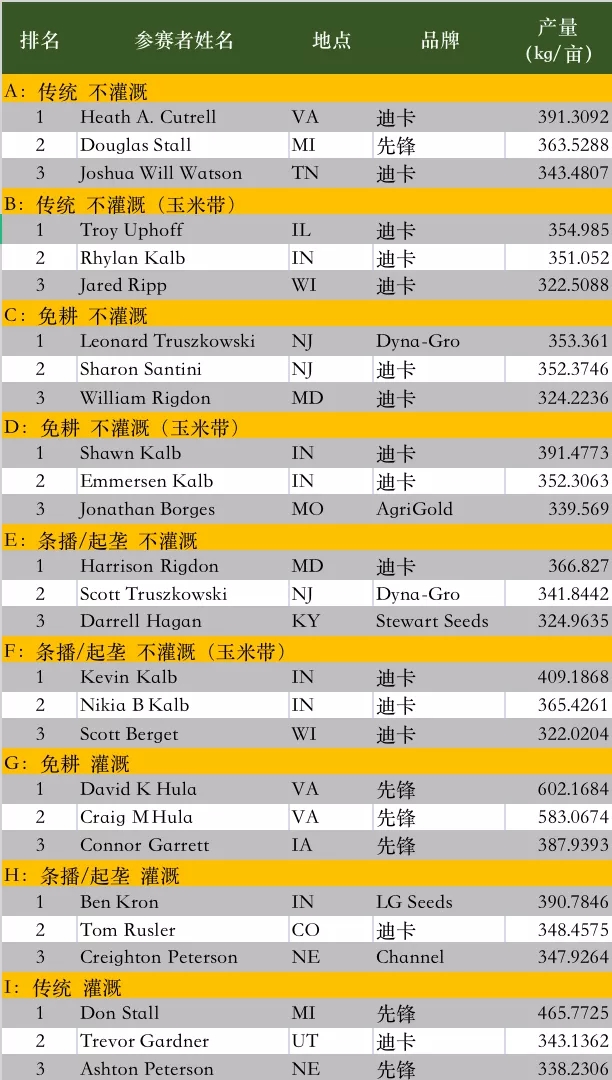 9個(gè)類別中產(chǎn)生的27位優(yōu)勝者平均單產(chǎn)比全國(guó)范圍內(nèi)預(yù)期產(chǎn)量水平高376.7593 蒲式耳/英畝。今年,NCYC最高產(chǎn)量為602.1684蒲式耳/英畝,折合約每畝2517公斤(折合為畝產(chǎn)量,下同),由弗吉尼亞州查爾斯市的David K Hula在G(免耕 灌溉組)田塊創(chuàng)造,使用的是先鋒公司的品種(編號(hào)P1222YHR)。