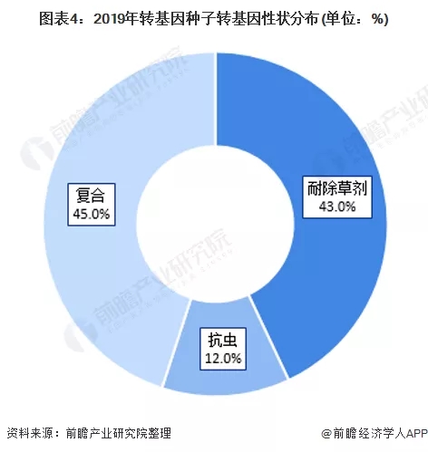 據(jù)ISAAA數(shù)據(jù)顯示,2019年,全球復(fù)合性狀增長了6%,相當(dāng)于8510萬公頃,覆蓋了全球45%的轉(zhuǎn)基因作物種植面積;耐除草劑作物種植面積減少至8150萬公頃,占比為43%;抗蟲性狀占比為12%。