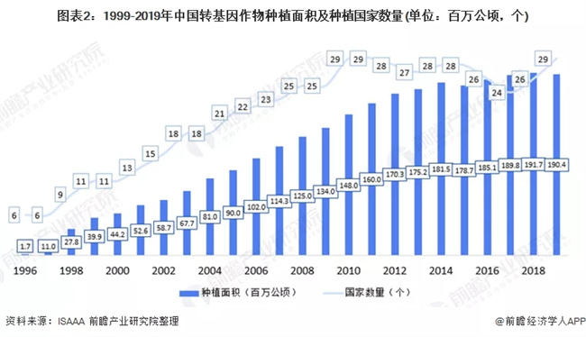 1996-2019年轉(zhuǎn)基因作物種植面積從170萬公頃攀升至1.904億公頃,年復(fù)合增長率22.8%,2013-2019年轉(zhuǎn)基因作物種植面積趨于穩(wěn)定,年復(fù)合增長率1.4%。