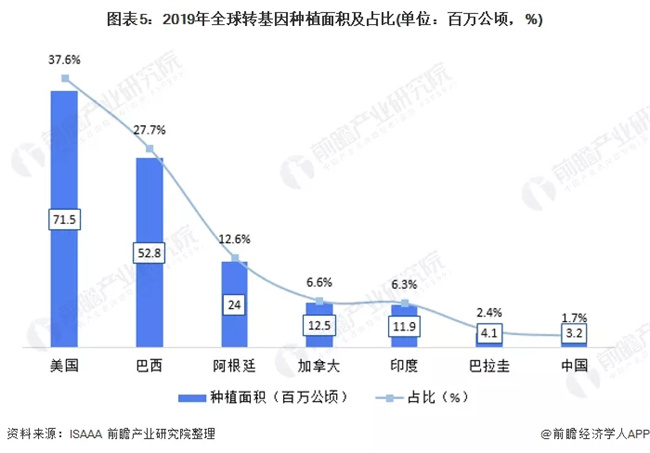 從國家層面看,全球轉(zhuǎn)基因種植國家兩極分化嚴(yán)重。ISAAA數(shù)據(jù)顯示,五大轉(zhuǎn)基因種植國家的種植面積占比近9成,其中,美國種植面積為71.5百萬公頃(37.55%);巴西種植面積為52.8百萬公頃(27.73%);阿根廷種植面積為24百萬公頃(12.61%);加拿大種植面積為12.5百萬公頃(6.57%);印度種植面積為11.9百萬公頃(6.25%)。中國的轉(zhuǎn)基因種植面積為3.2百萬公頃,占比1.68%,位列第7位。
