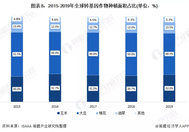 全球四大轉(zhuǎn)基因種植品種包括大豆、玉米、棉花、油菜,2019年,四大品種種植面積占全球轉(zhuǎn)基因總種植面積99.1%,占比從高到低依次為大豆48.3%、玉米32.0%、棉花13.5%、油菜5.3%。