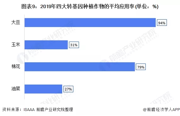 從作物種植面積看來,2019年,轉(zhuǎn)基因大豆的應(yīng)用率最高,達(dá)到了94%;其次是棉花,應(yīng)用率為79%、玉米和油菜的應(yīng)用率仍相對較小,分別為31%和27%。