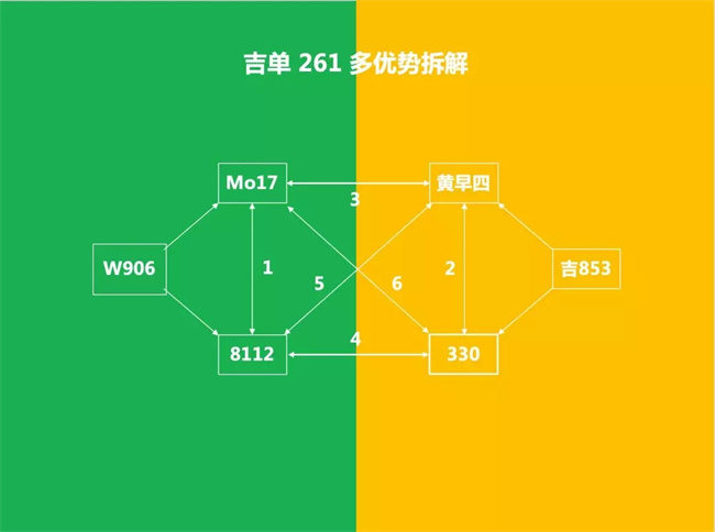 如最原始的組合煙單14 = 黃早四 ×Mo17,后來利用了330 與黃早四改良選育出吉853,重新組合為吉單180= Mo17 × 吉853,再后來利用Mo17 ×8112 選育出W9706,然后再與吉853 組合成吉單261。同樣在煙單14= 黃早四 ×Mo17模式中,只有一種優(yōu)勢,就是黃早四與MO17 的雜交優(yōu)勢,在吉單180 = Mo17 × 吉853,可以分解出二個優(yōu)勢,那就是Mo17 與黃早四優(yōu)勢及Mo17 與330 的二種優(yōu)勢(吉853 = 黃早四 ×330),如此可以在很多品種中找到三種優(yōu)勢、四種優(yōu)勢、五種優(yōu)勢、六種優(yōu)勢,六種優(yōu)勢就是最高境界,就是說構成所有的材料之間都有優(yōu)勢,如構母本的二個材料之間有強優(yōu)勢,構成父本的二個材料之間有強優(yōu)勢,并且構成母本的二個材料分別與父本的二個材料之間仍有優(yōu)勢。