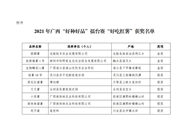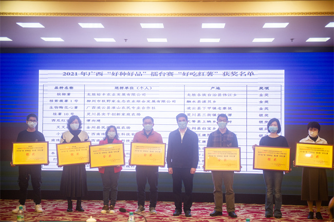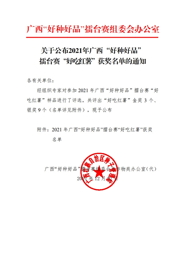 為推進我區(qū)品種培優(yōu)、品質提升和質量興種、品牌強種,我站組織專家對參加2021年廣西“好種好品”擂臺賽“好吃紅薯”35樣品進行了評選,共評出“好吃紅薯”金獎3個、銀獎9個。12月24日,我站召開“好吃紅薯”,對獲獎品種進行集中品鑒。自治區(qū)農業(yè)農村廳黨組成員、副廳長文信連出席會議,并為獲獎品種頒發(fā)牌匾。