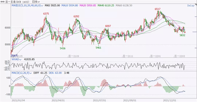 2021年大豆主力合約連續(xù)第三年上漲,年漲幅1.80%,年內(nèi)最高創(chuàng)6517元/噸的歷史新高。