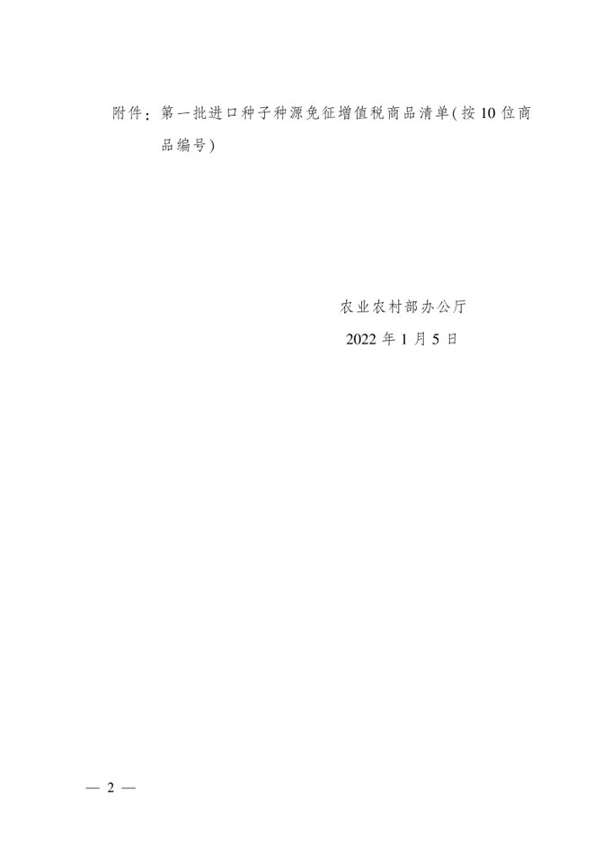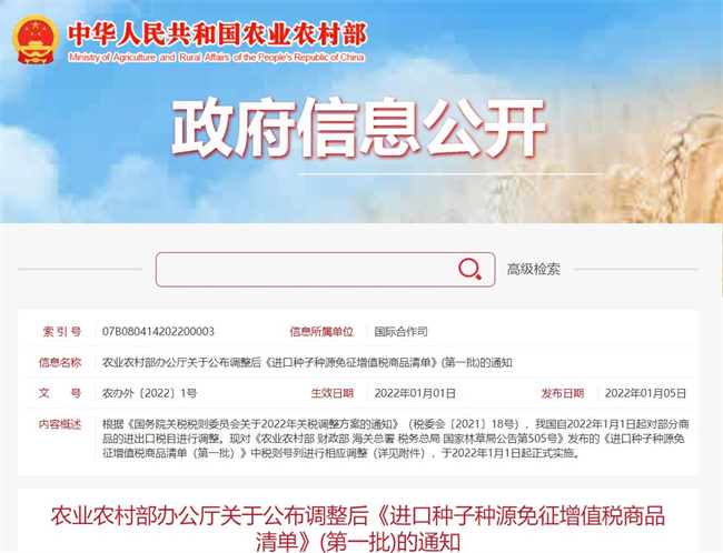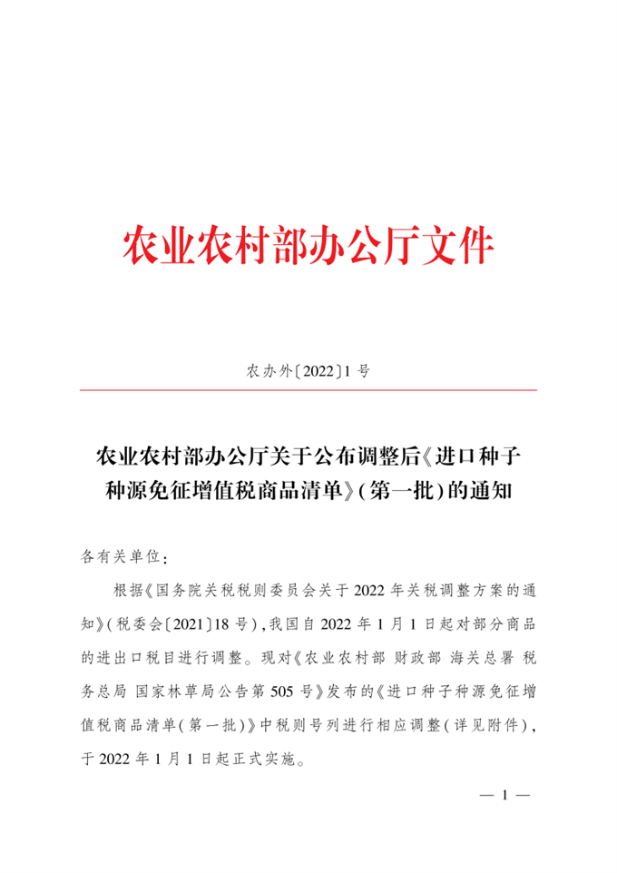 根據(jù)《國(guó)務(wù)院關(guān)稅稅則委員會(huì)關(guān)于2022年關(guān)稅調(diào)整方案的通知》(稅委會(huì)〔2021〕18號(hào)),我國(guó)自2022年1月1日起對(duì)部分商品的進(jìn)出口稅目進(jìn)行調(diào)整?,F(xiàn)對(duì)《農(nóng)業(yè)農(nóng)村部 財(cái)政部 海關(guān)總署 稅務(wù)總局 國(guó)家林草局公告第505號(hào)》發(fā)布的《進(jìn)口種子種源免征增值稅商品清單(第一批)》中稅則號(hào)列進(jìn)行相應(yīng)調(diào)整(詳見附件),于2022年1月1日起正式實(shí)施。