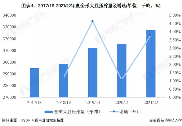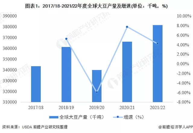 2017/18-2020/21年度,全球大豆產(chǎn)量波動較大。2020/21年度,全球大豆產(chǎn)量達到了366231千噸,相比2019/20年度增加了7.75%。根據(jù)美國農(nóng)業(yè)部于2021年12月的預測數(shù)據(jù),2021/22年,全球大豆產(chǎn)量將達到381783千噸。