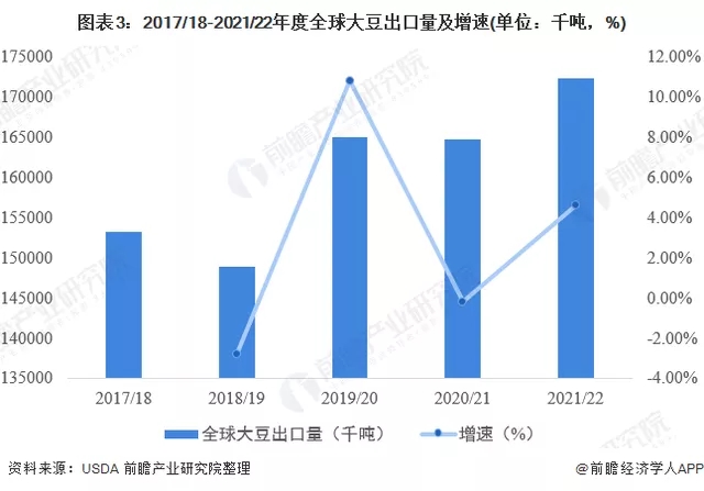 2017/18-2020/21年度,全球大豆出口量呈波動態(tài)勢。2020/21年度,全球大豆出口量達到了164746千噸,較2019/20小幅下降0.19%。根據(jù)美國農(nóng)業(yè)部于2021年12月的預測數(shù)據(jù),2021/22年,全球大豆出口量將達到172340千噸,相比2020/21年度上漲4.61%。