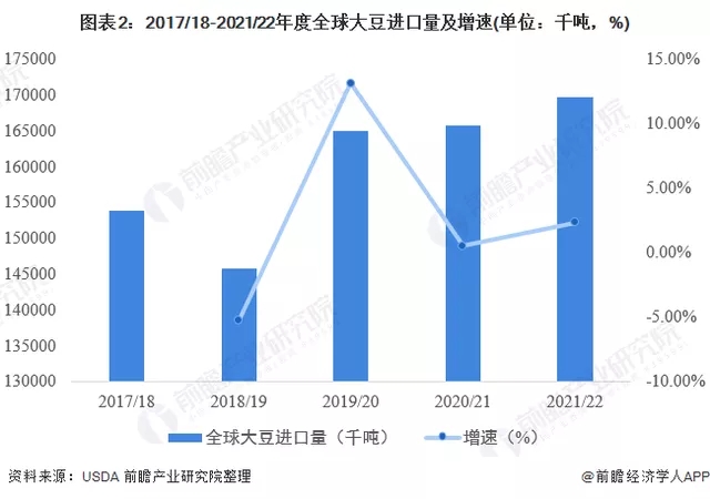 2017/18-2020/21年度,全球大豆進口量整體有所上升。2020/21年度,全球大豆進口量達到了165837千噸,與2019/20年度基本保持一致。根據(jù)美國農(nóng)業(yè)部于2021年12月的預測數(shù)據(jù),2021/22年,全球大豆進口量將達到169781千噸。