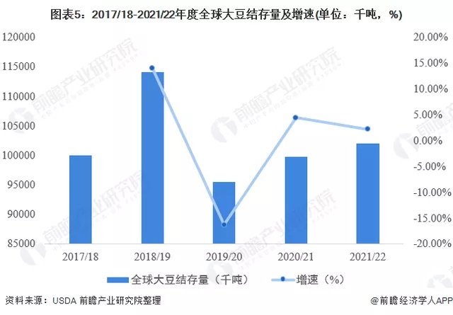 2017/18-2020/21年度,全球大豆結(jié)存量有所下降。2020/21年度,全球大豆結(jié)存量為99808千噸,相比2019/20年度上升了4.48%。根據(jù)美國農(nóng)業(yè)部于2021年12月的預測數(shù)據(jù),2021/22年,全球大豆結(jié)存量將達到102001千噸。