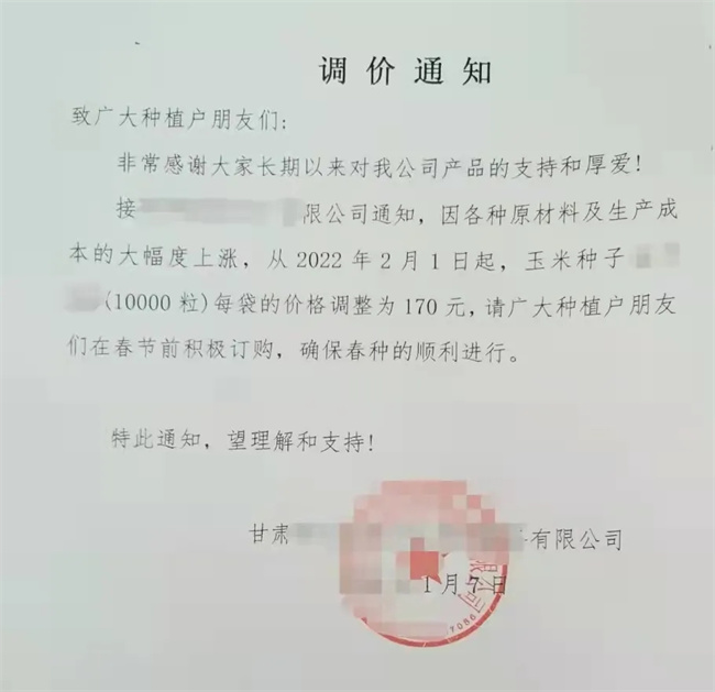 某種子公司在1月7號(hào)發(fā)布的漲價(jià)通知。
