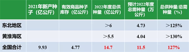 2022年,商品種子有效供給量約14.7億公斤。若玉米價(jià)格繼續(xù)保持在1.3元/市斤高位,則需種量保持穩(wěn)定,按2021年11.5億公斤的商品種子用量計(jì)算,2022年大田玉米生產(chǎn)用種充足有余。