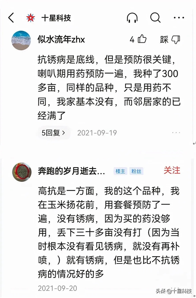 如果一個(gè)玉米品種能夠【高抗雙倒】,僅僅是“抗銹差一些”甚至是【不抗銹病】,反倒是很容易對(duì)付的事情了——每畝地僅僅幾元錢的殺菌劑一噴就可以了。