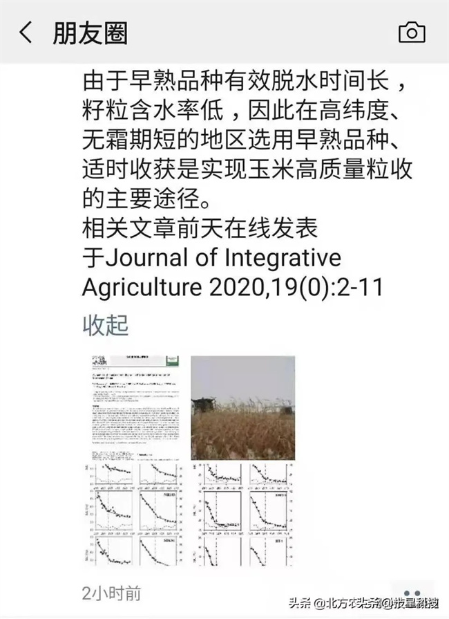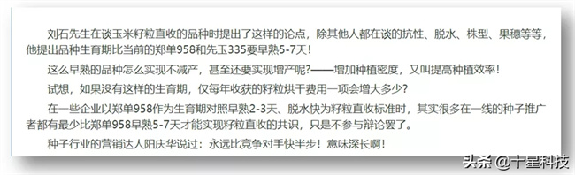 下圖,是劉石先生關(guān)于【玉米籽粒機收+早熟+密植】的觀點截圖: