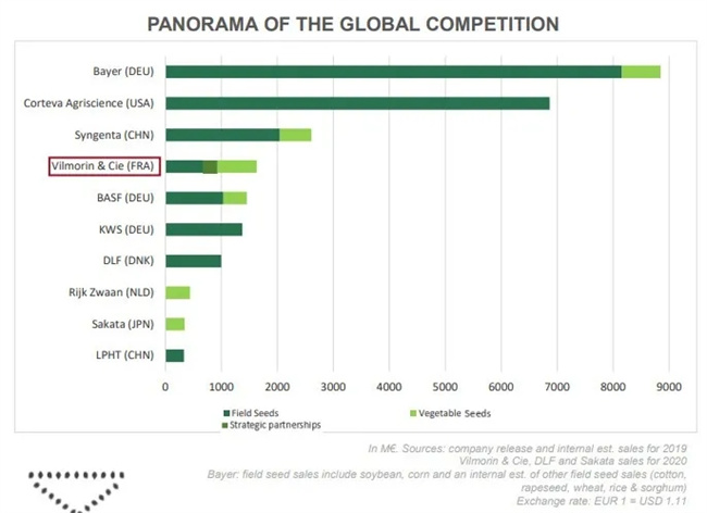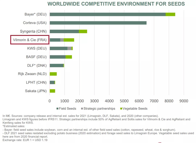 ↑ 2021年全球排名前十的種子企業(yè)營(yíng)收表,單位為百萬歐元。其中,深綠色為大田作物種子,淺綠色為蔬菜種子,灰色為戰(zhàn)略合作伙伴銷售份額。