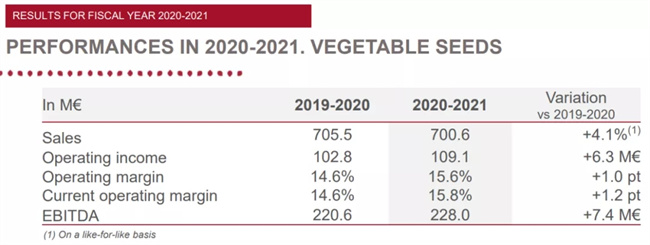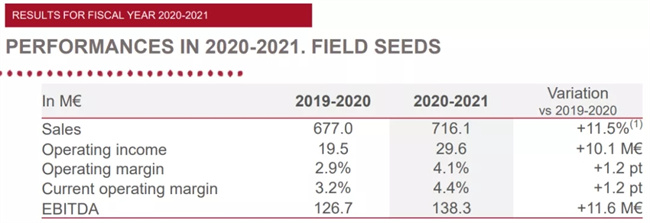 2020-2021年度財(cái)報(bào)中顯示,利馬格蘭蔬菜種子銷售額為7.006億歐元,同比增長(zhǎng)了4.1%。大田種子銷售額為7.16億歐元,相比去年增長(zhǎng)顯著。在歐洲,玉米、向日葵、油菜籽等銷售量顯著增加,導(dǎo)致大多數(shù)戰(zhàn)略作物的市場(chǎng)份額增加,尤其是油菜籽在歐洲排名第一。