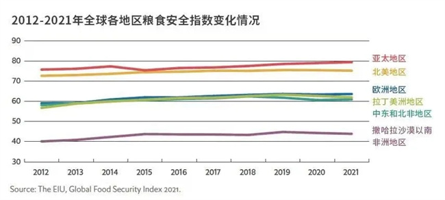 2012-2021年全球各地區(qū)糧食安全指數(shù)變化情況。