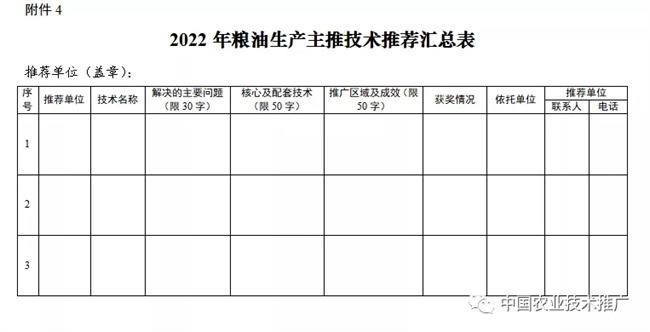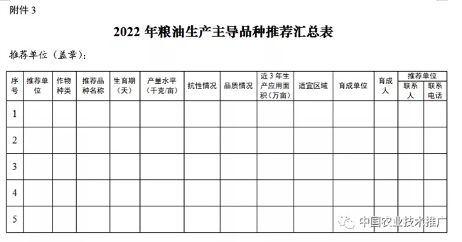 (二)各推薦單位審核通過后,需填寫《2022年糧油生產(chǎn)主導(dǎo)品種匯總表》(附件3)和《2022年糧油生產(chǎn)主推技術(shù)匯總表》(附件4)。