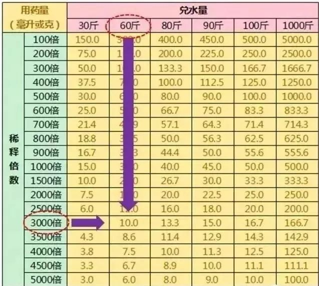 舉個例子,藥劑的稀釋倍數(shù)是3000倍,要配60斤水,所需要的藥劑量就是10毫升或10克。同理,30斤水加了6毫升的藥劑,它的稀釋倍數(shù)是2500倍。 (如表二)