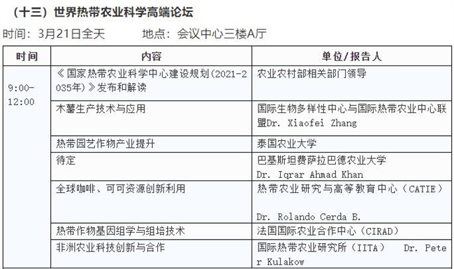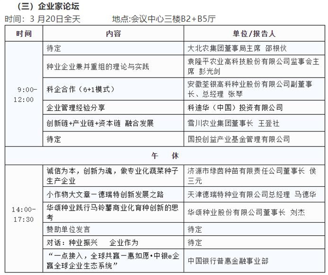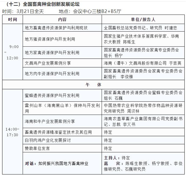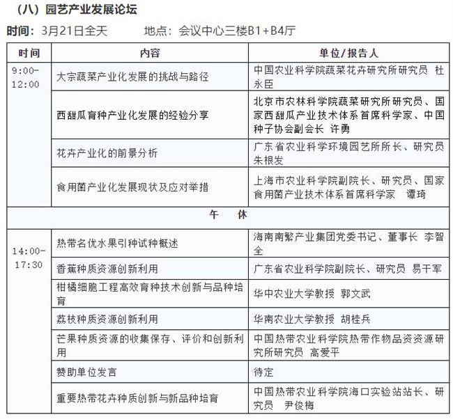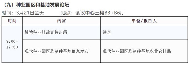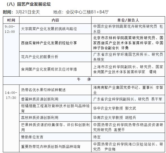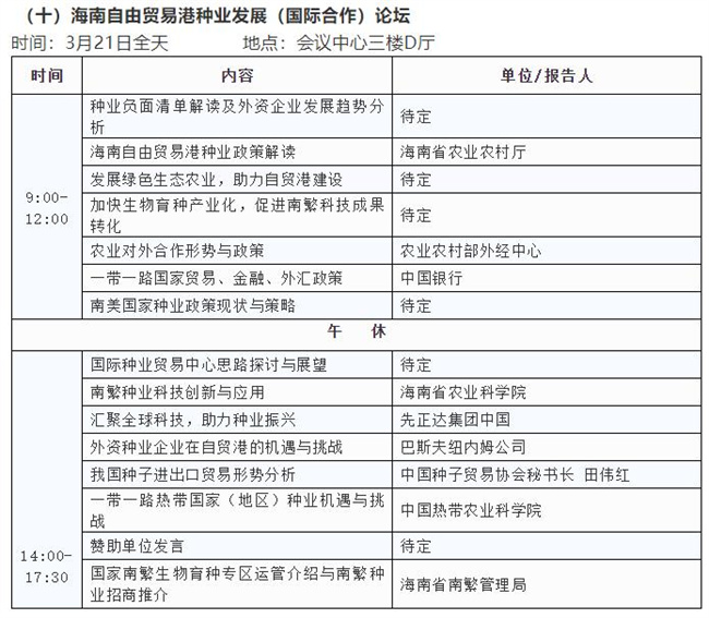3月19日舉辦主論壇;3月20日平行舉辦農(nóng)作物種質(zhì)資源保護(hù)與利用論壇、種業(yè)技術(shù)創(chuàng)新論壇、企業(yè)家論壇、種業(yè)知識(shí)產(chǎn)權(quán)保護(hù)論壇、水稻產(chǎn)業(yè)鏈發(fā)展論壇、玉米產(chǎn)業(yè)鏈發(fā)展論壇、油料產(chǎn)業(yè)發(fā)展論壇,3月21日平行舉辦園藝產(chǎn)業(yè)發(fā)展論壇、種業(yè)園區(qū)和基地發(fā)展論壇、海南自由貿(mào)易港種業(yè)發(fā)展(國(guó)際合作)論壇、南繁發(fā)展論壇、全國(guó)畜禽種業(yè)創(chuàng)新發(fā)展論壇、世界熱帶農(nóng)業(yè)科學(xué)高端論壇;3月22日在三亞崖州舉辦農(nóng)作物品種田間展示;會(huì)議期間,還將同時(shí)舉辦室內(nèi)成果、技術(shù)、產(chǎn)品展覽展示。