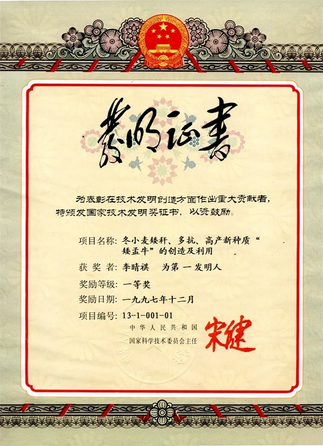 ▲1997年,李晴祺教授榮獲的國家技術(shù)發(fā)明一等獎(jiǎng)證書。