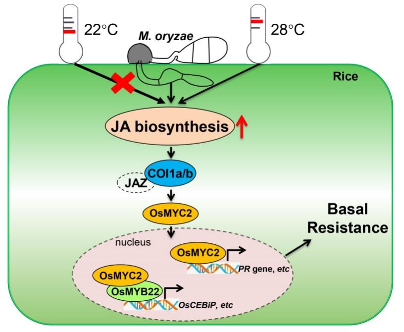 該研究成果表明,22℃時(shí)的暖溫環(huán)境削弱植物激素茉莉酸調(diào)節(jié)的基礎(chǔ)抗性,有利于稻瘟病害發(fā)生,而施用茉莉酸甲酯能明顯提高暖溫環(huán)境下水稻對(duì)稻瘟病抗性。因此,茉莉酸甲酯可作為稻瘟病防控的有效藥物。