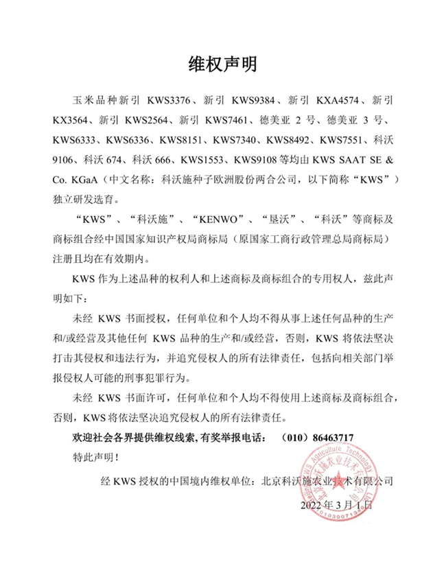 3月1日,經(jīng)KWS 授權(quán),KWS在中國(guó)境內(nèi)的維權(quán)單位——北京科沃施農(nóng)業(yè)技術(shù)有限公司于2022年3月1日發(fā)布維權(quán)聲明。