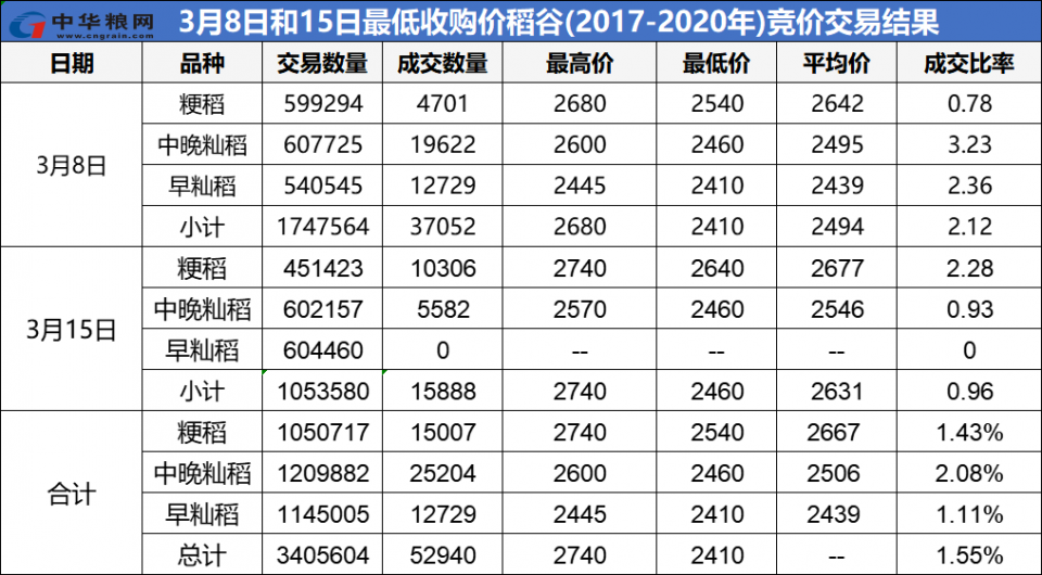 3月8日和3月15日,國家糧食交易中心共計投放最低收購價稻谷341萬噸,其中早秈稻投放114.5萬噸,成交1.27萬噸,成交率1.11%;中晚秈稻實際投放121萬噸,成交2.52萬噸,成交率2.08%;粳稻實際投放105萬噸,成交1.5萬噸,成交率1.43%。單就成交率而言,毫無驚喜!