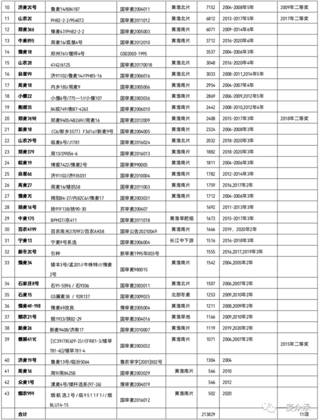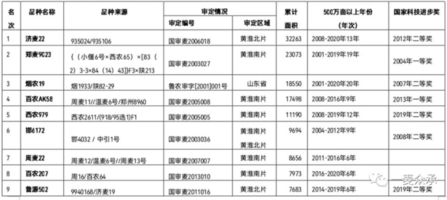 累計(jì)種植面積超過(guò)1億畝的有5個(gè):濟(jì)麥22、鄭麥9023、煙農(nóng)19、百農(nóng)AK58和西農(nóng)979;累計(jì)超過(guò)5000萬(wàn)畝有7個(gè):邯6172、周麥22、百農(nóng)207、魯源502、濟(jì)麥20號(hào)、山農(nóng)20和鄭麥366;累計(jì)超過(guò)2000萬(wàn)畝的有10個(gè)。