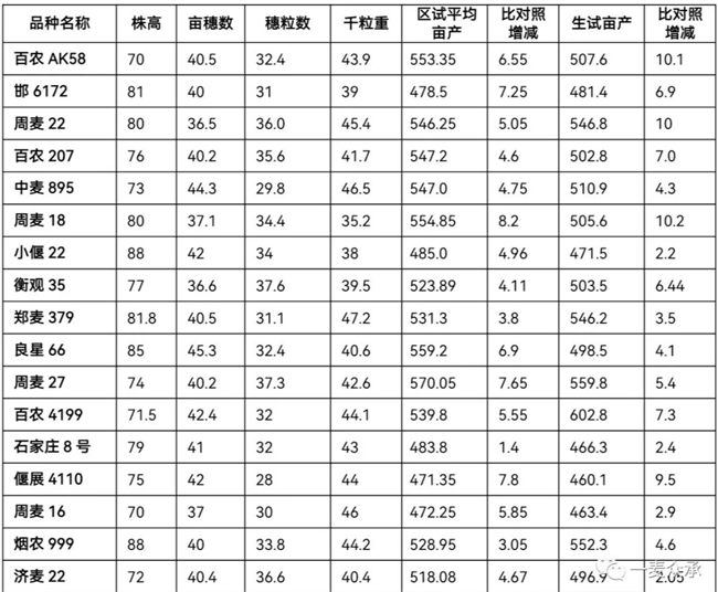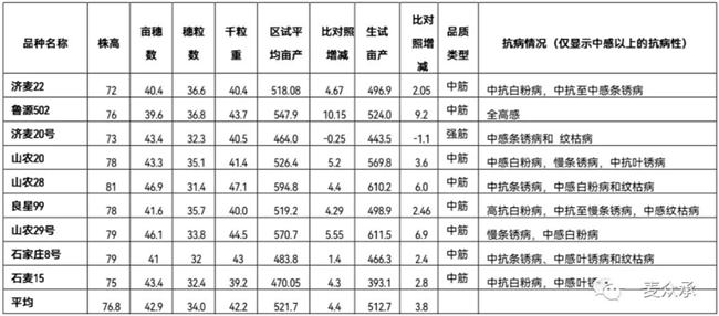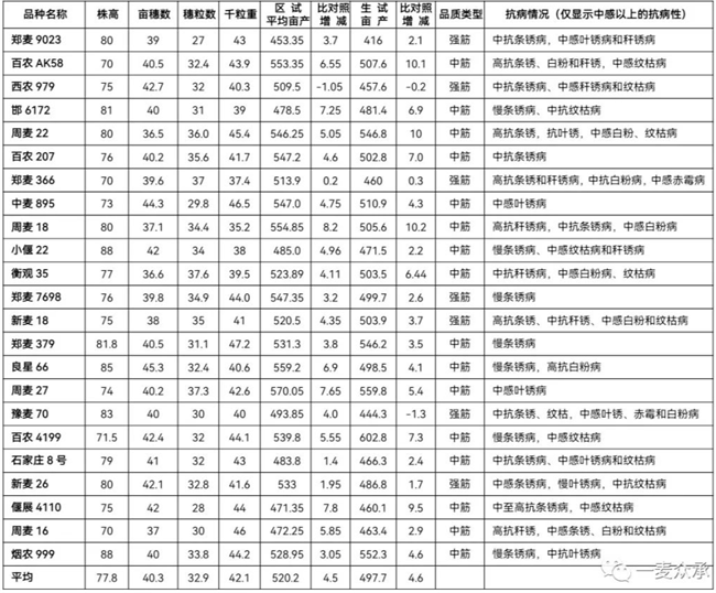 從統(tǒng)計(jì)結(jié)果來(lái)看,黃淮南片和北片平均數(shù)據(jù)差異不大明顯,南片平均株高略高1cm,北片平均畝穗數(shù)高出2.6萬(wàn),平均穗粒數(shù)高出1.1粒,平均千粒重、區(qū)試畝產(chǎn)和比對(duì)照增產(chǎn)都基本相當(dāng)。