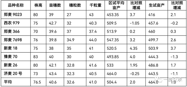 黃淮北片平均株高76.8cm,變化范圍72-81cm,平均畝穗數(shù)42.9萬(wàn)穗,變化范圍39.6萬(wàn)-46.1萬(wàn)穗,平均穗粒數(shù)34.0粒,變化范圍31.4-36.8粒,平均千粒重42.2g,變化范圍39.2-47.1g;2年區(qū)試平均畝產(chǎn)521.7kg,變化范圍464.0-594.8kg,平均比對(duì)照增產(chǎn)4.4%,生產(chǎn)試驗(yàn)平均畝產(chǎn)512.7kg,變化范圍393.1-611.5kg,平均比對(duì)照增產(chǎn)3.8%。